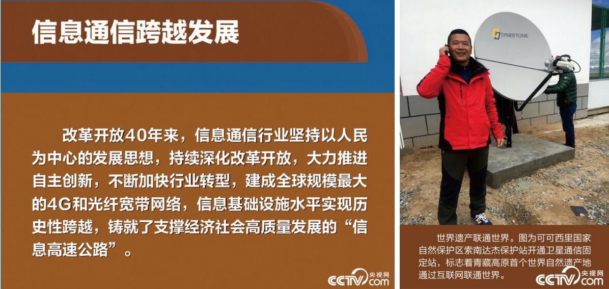 在“大國氣象”展區(qū)有這樣一張圖片——標注“世界遺產(chǎn)聯(lián)通世界。圖為可可西里國家級自然保護區(qū)索南達杰保護站開通衛(wèi)星通信固定站,標志著青藏高原首個世界自然遺產(chǎn)地通過互聯(lián)網(wǎng)聯(lián)通世界”。這是2017年8月由中國電信集團衛(wèi)星通信有限公司、深圳天海世界衛(wèi)星通信科技有限公司以及協(xié)同衛(wèi)星通信(深圳)有限公司聯(lián)合捐贈和援建的衛(wèi)星通信固定站項目。